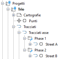 È possibile organizzare gli oggetti di progetto all'interno di sottocartelle utilizzando Autodesk Vault. Le sottocartelle vengono visualizzate nel prospetto se contengono un oggetto di progetto. L'illustrazione seguente mostra due sottocartelle per i tracciati del progetto nel prospetto presenti all'interno della cartella Tracciati asse.