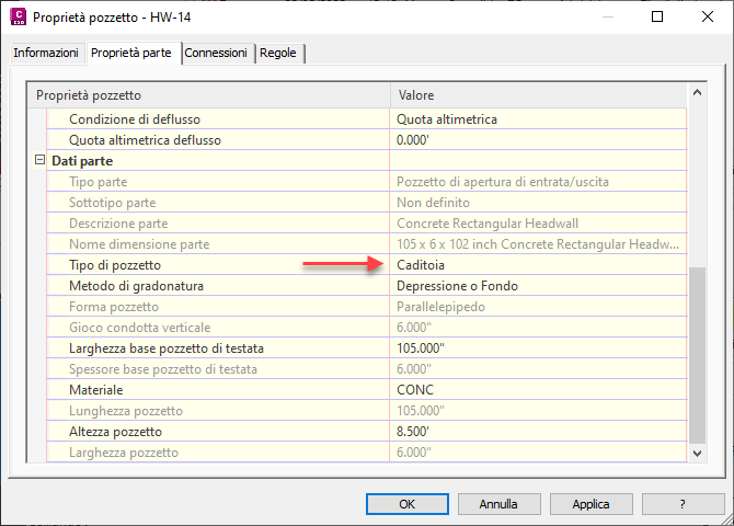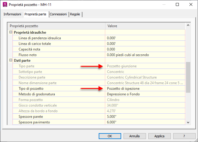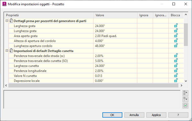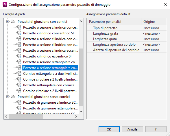 Le impostazioni di default per i pozzetti possono essere specificate nella finestra di dialogo Modifica impostazioni oggetti - Pozzetto .
