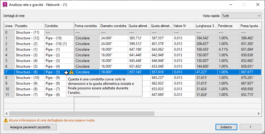Quando si seleziona una riga nella tabella dei risultati, il riquadro a destra mostra informazioni dettagliate sulla condotta e sul pozzetto nella linea selezionata.