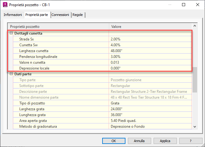 È possibile utilizzare la sezione Dettagli cunetta della finestra di dialogo Proprietà pozzetto per definire le proprietà dell'area stradale intorno alla presa. Queste proprietà vengono utilizzate dal comando Analisi rete a gravità per il calcolo dell'analisi della presa.