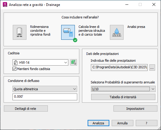 È possibile selezionare tre tipi di analisi: Ridimensiona condotte e ripristina fondi, Calcola linee di pendenza idraulica e di carico totale e Analisi presa.