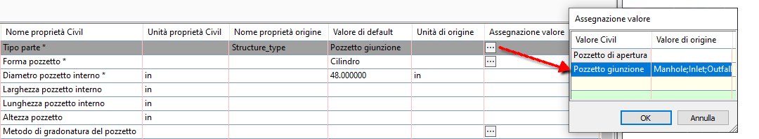 Per inserire pozzetti di ispezione, entrate e caditoie come tipi di parte Giunzione, impostare Assegnazione valore su Tipo parte. Ad esempio, se sono stati specificati i valori di attributo Pozzetto di ispezione, Entrata e Caditoia nei dati ArcGIS per indicare il tipo di pozzetto, questi valori possono essere immessi nella finestra di dialogo Assegnazione valore.