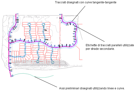 Gli oggetti tracciato possono rappresentare assi stradali, reti di condotte e altre linee base della costruzione. La creazione e la definizione di un tracciato planimetrico sono tra i primi passaggi nella progettazione di strade, ferrovie o aree delimitate. È possibile trascinare la geometria di tracciato come polilinea, quindi creare il tracciato con nome da tale geometria. Gli strumenti di layout tracciato consentono di creare un oggetto tracciato con maggiore precisione. È inoltre possibile apportare modifiche ai tracciati mediante i grip o i comandi della barra degli strumenti Strumenti di layout tracciato, mantenendo automaticamente la tangenza tra i componenti del tracciato.