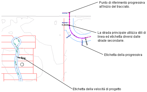 Attraverso gli stili viene controllato l'aspetto visivo dei componenti del tracciato e delle etichette. È possibile creare stili specifici da utilizzare nelle varie fasi di un progetto. Quando si crea un tracciato, si specifica lo stile per l'oggetto tracciato e le relative etichette. Nella finestra di dialogo Etichette tracciato è possibile creare gruppi di stili per le etichette del tracciato e salvarle come una serie di etichette da utilizzare con altri tracciati.