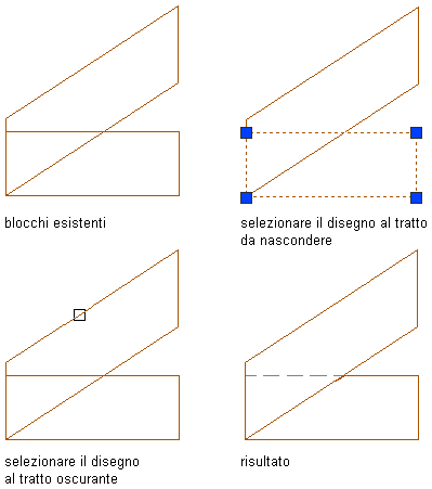 Oscurare o "nascondere" una regione di disegno al tratto in relazione all'altro disegno al tratto. Usare questa funzione se si desidera specificare che una entità si estenda oltre o al disotto di un altra entità visualizzata in primo piano. Il disegno al tratto oscurato viene collocato sul layer specificato dal pulsante livello Nascosto.