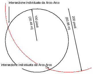 Le intersezioni vengono posizionate tra un raggio dell'arco di 100 piedi con un centro nel punto 1 e un raggio dell'arco di 200 piedi con il centro nel punto 2.