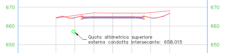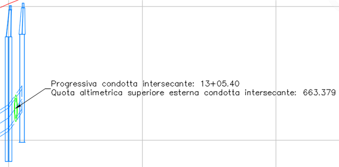Se la condotta intersecante viene spostata in un'altra progressiva lungo il tracciato, le etichette vengono aggiornate con le nuove informazioni di progressiva e quota altimetrica.