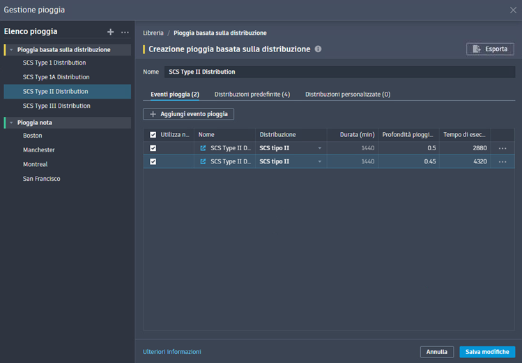 - Modificare gli eventi pioggia basati sulla distribuzione.