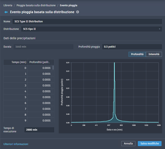 Nota: Devono essere presenti almeno 2 voci contenenti l'incremento dei minuti e la relativa profondità di pioggia in pollici (o millimetri, a seconda delle unità della Carta).