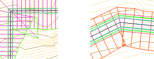Il comportamento di correzione automatica del modellatore di Autodesk Civil 3D viene applicato alle posizioni di intersezione tangente-tangente, tangente-curva e tangente-curva-tangente nei modellatori che utilizzano linee caratteristiche o tracciati/profili come linee di base e le sezioni tipo presentano larghezze coerenti in base alle forme all'interno di una sezione tipo.