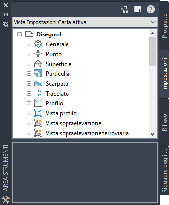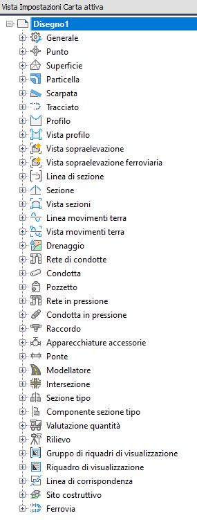 È possibile utilizzare la scheda Impostazioni per gestire gli stili degli oggetti di Autodesk Civil 3D e per controllare le impostazioni delle Carte e dei comandi.