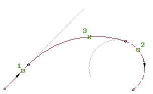 È possibile aggiungere questa entità tra due linee, due curve o una linea e una curva. Le entità di associazione (1, 2) e il punto di passaggio (3) determinano la lunghezza e il raggio della curva. Non è possibile modificare il raggio e la lunghezza di questo tipo di curva.