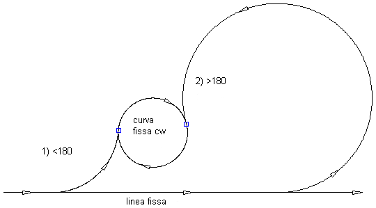 Nella seguente illustrazione viene mostrato un raccordo a curva libera tra una linea e una curva in senso orario (a sinistra) con un raggio specificato: