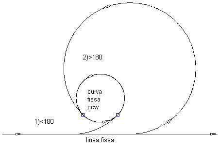 L'entità viene definita dalle entità di associazione (1, 2), dal raggio (3), dall'angolo di soluzione e dalla condizione che indica se la soluzione richiesta è di continuità o di flesso. La soluzione può variare in modo significativo, in base alla modalità di definizione dei vincoli.