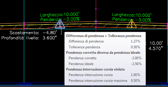 Se Pendenza trasversale corretta non è uguale a Pendenza trasversale ideale, viene visualizzata una violazione.