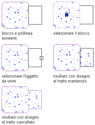 Unione di polilinee chiuse contigue, cerchi, tratteggi o blocchi in un singolo oggetto a contorno chiuso o entità di disegno al tratto.