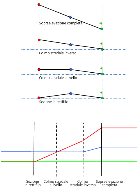 Nell'illustrazione che segue è rappresentato il metodo di rotazione All'interno della curva per una sezione stradale a doppia falda e unica carreggiata.