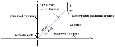 Il punto 2 viene posizionato ruotando un orientamento di 45°0'0" (50 gradi) nel Quadrante 1 (NE) ad una distanza di 100 piedi dal punto strumento con la descrizione PT.