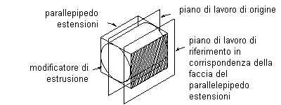 Un piano di lavoro di riferimento viene definito come piano sulla faccia delle estensioni di un modificatore. Ogni modificatore presenta un'estensione, o casella di delimitazione, invisibile che definisce le estensioni dell'oggetto. È possibile creare un piano di lavoro che faccia riferimento ad uno dei piani dell'estensione. Per definire un piano di lavoro di riferimento, selezionare un modificatore e un piano di lavoro di origine che rappresenti la direzione del piano da creare. Le estensioni, o caselle di delimitazioni, dell'oggetto vengono rilevate e per la selezione sono disponibili due piani di lavoro di riferimento validi. Se il modificatore viene spostato o ridimensionato, viene spostato anche il piano di lavoro di riferimento.