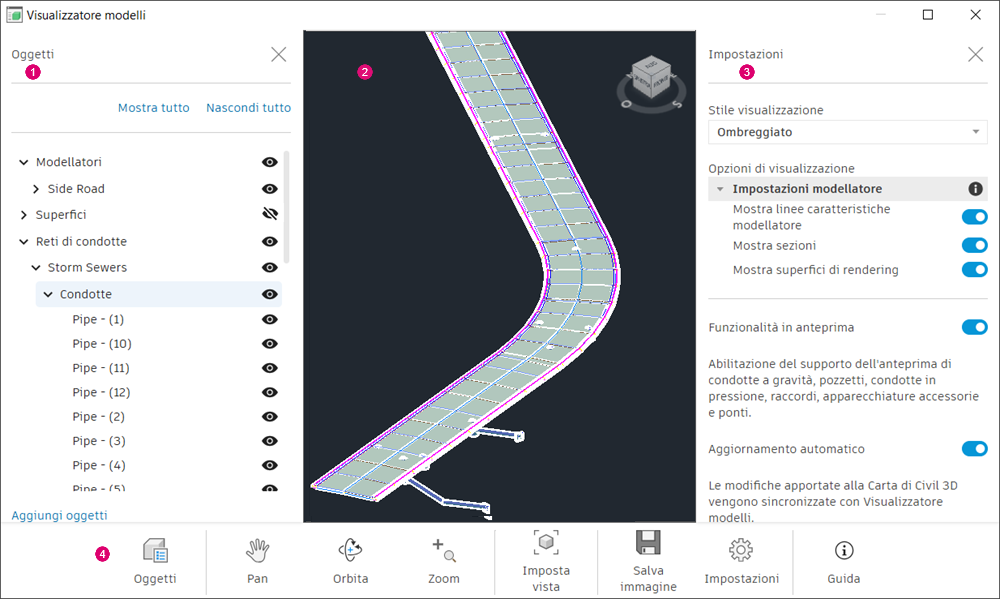nella barra degli strumenti del Visualizzatore. Per ulteriori informazioni, vedere Gruppo Impostazioni di Visualizzatore modelli di Civil 3D.