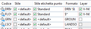 Di seguito sono illustrati alcuni esempi di identificatori descrizione, assieme alle relative proprietà Codice, Stile punto, Stile etichetta punto, Formato e Layer.
