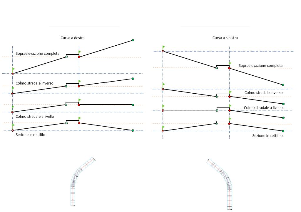 Nell'illustrazione che segue è rappresentato il metodo di rotazione lato sinistro per una sezione stradale a singola falda e doppia carreggiata.