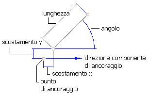 - Punto iniziale, Lunghezza e Angolo: questo metodo consente di ancorare il punto iniziale del componente linea al componente di ancoraggio. Quindi specificare la lunghezza e l'angolo. Nell'illustrazione che segue viene mostrata una linea definita mediante questo metodo: