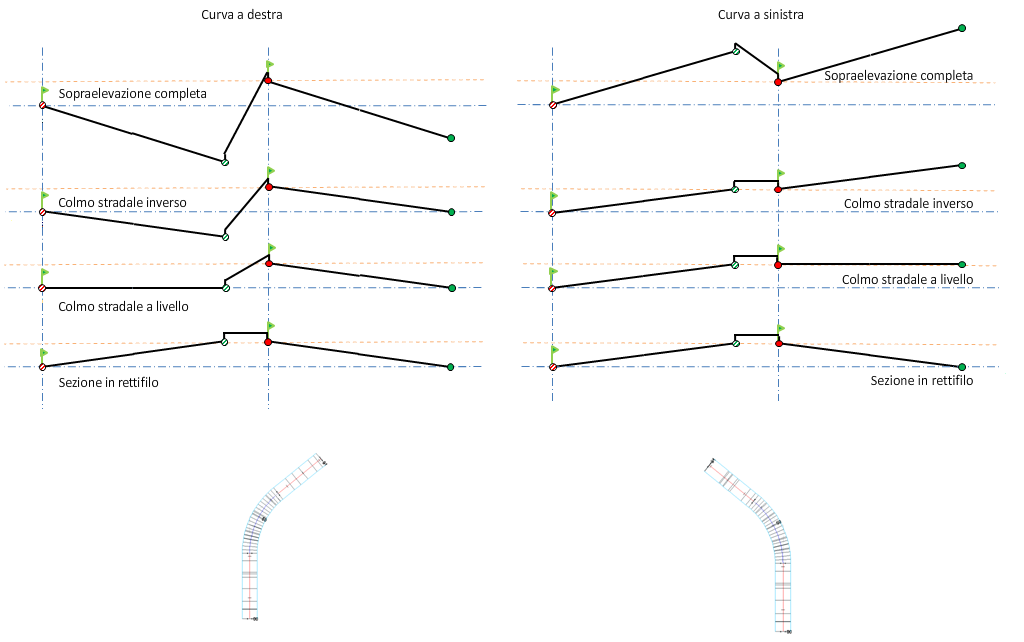 Nell'illustrazione che segue è rappresentato il metodo di rotazione lato sinistro per una sezione stradale a singola falda e doppia carreggiata.