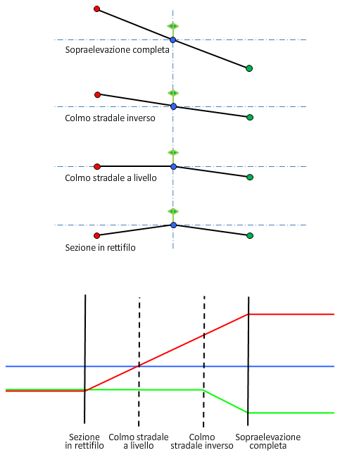 Nell'illustrazione che segue è rappresentato il metodo di rotazione Centro - Linea base per una sezione stradale a doppia falda e unica carreggiata.