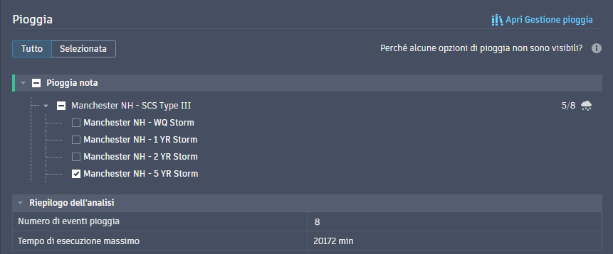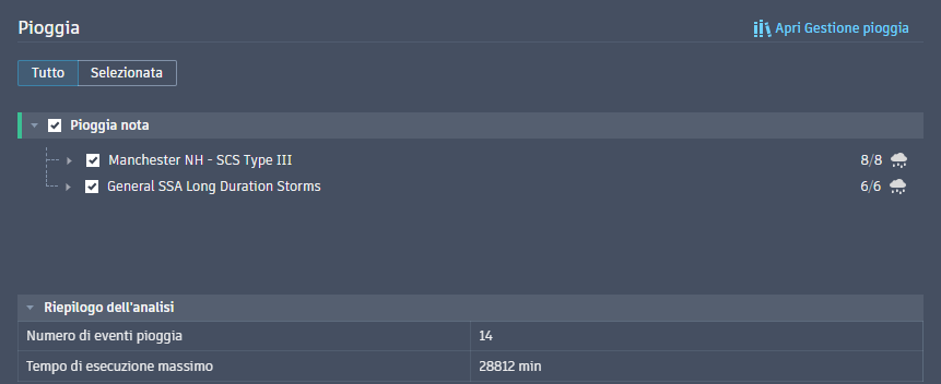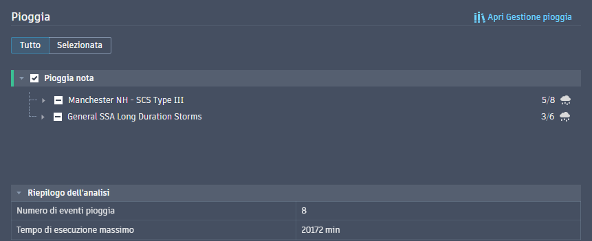I conteggi a destra dei gruppi pioggia rappresentano il numero totale di eventi selezionati dal numero possibile di eventi nel gruppo. Il riepilogo dell'analisi nella parte inferiore visualizza il numero totale di Eventi pioggia applicati al sistema di drenaggio e il tempo di esecuzione massimo specificato degli eventi.