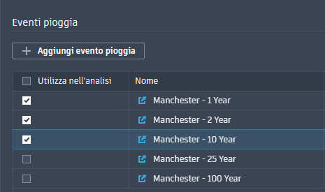 - Nell'Elenco pioggia, selezionare il gruppo pioggia contenente gli eventi pioggia desiderati.