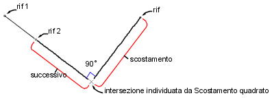 Il comando Scostamento quadrato elenca la distanza successiva e la distanza di scostamento al punto dell'intersezione.