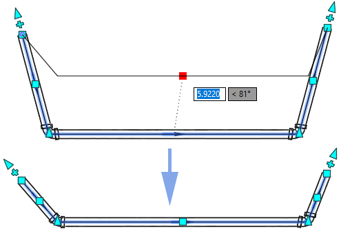 Nelle seguenti descrizioni, ricordare che la regolazione dei rami con grip non impedisce la modifica dell'angolo di una condotta oltre la deflessione consentita. Le condotte che hanno superato la deflessione consentita ammissibile possono essere rilevate mediante il comando Esegui controllo di progettazione.