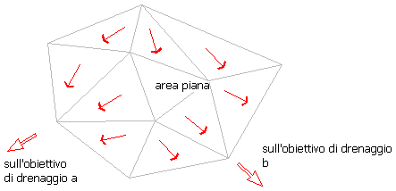 Se alcuni triangoli opposti non piani pendono in discesa dal contorno dell'area piana ma tutti defluiscono allo stesso punto di riferimento di drenaggio, l'area piana fa parte del bacino idrografico per tale punto di riferimento di drenaggio “a”, come illustrato nella figura seguente: