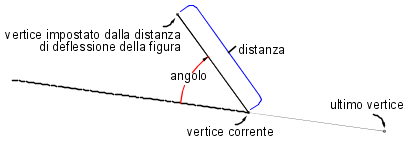 Creare un vertice della figura utilizzando un angolo di deflessione e una distanza. L'angolo di deflessione viene ruotato in senso orario dall'azimut corrente. Per poter utilizzare questo comando è necessario che nella figura siano presenti due o più vertici.