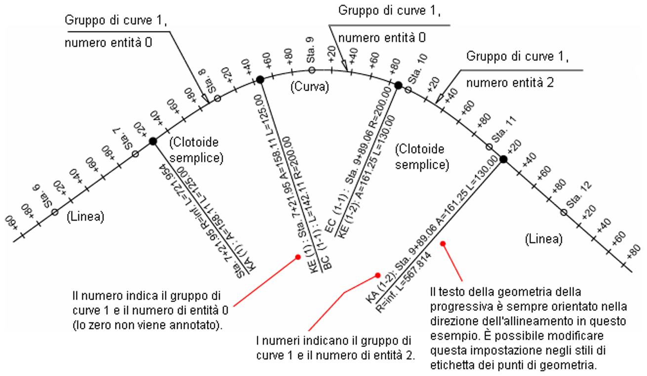 Durante la creazione, i tracciati vengono etichettati automaticamente con le etichette specificate nella finestra di dialogo Etichette tracciato. Le etichette vengono applicate lungo il tracciato in punti specifici, ad esempio le progressive principali e secondarie.