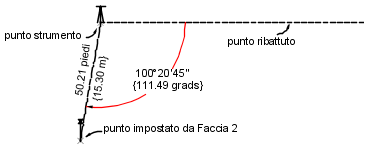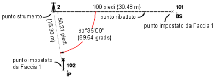 Il punto 101 viene posizionato ruotando un angolo orizzontale di 0 gradi a destra dalla Faccia 1 e un angolo verticale di 100 piedi ad una distanza di 30.480 m dal punto strumento con la descrizione PR.