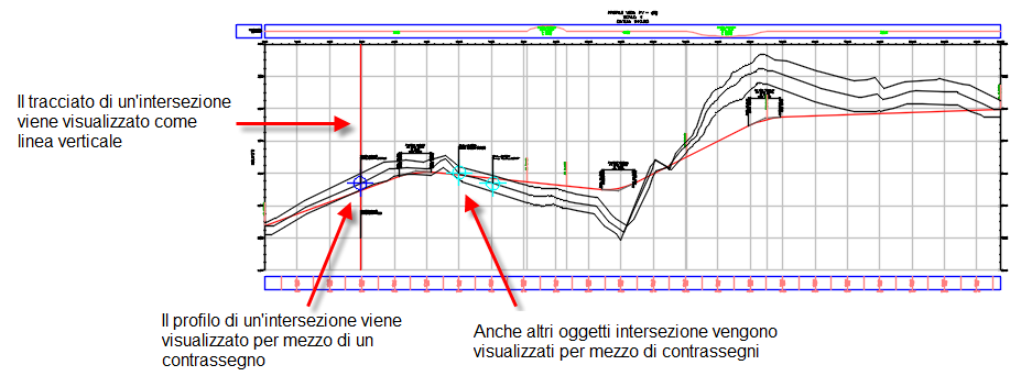 È possibile aggiungere intersezioni a viste profilo per identificare i punti in cui gli oggetti lineari intersecano il profilo rispetto al tracciato principale.