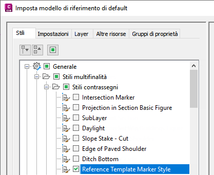 Selezionare le caselle di controllo relative agli stili e alle impostazioni a cui fare riferimento per default. Nell'esempio seguente è selezionato solo Stile contrassegno modello di riferimento.