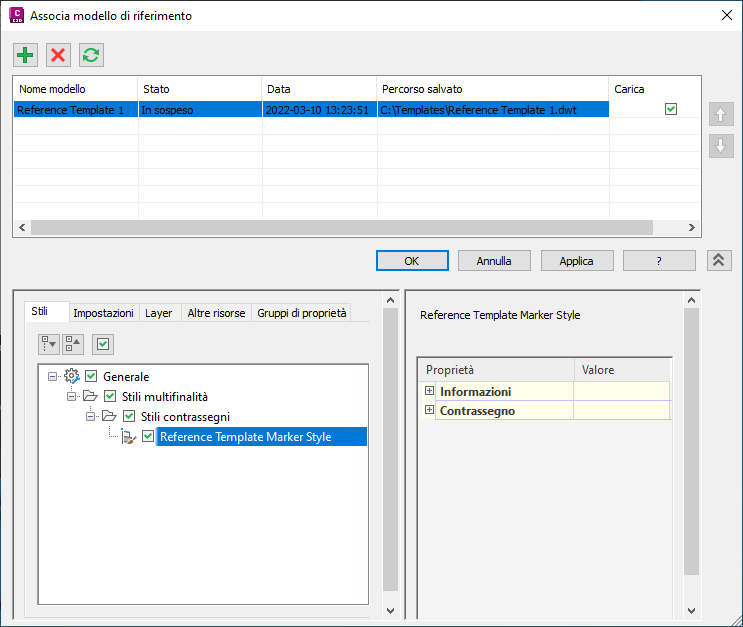Nota: Se si deseleziona la casella di controllo Carica e si fa clic su Applica o su OK, i componenti non utilizzati da un modello di riferimento vengono rimossi dalla Carta e tale Carta non viene aggiornata con le ulteriori modifiche apportate al modello di riferimento. I componenti che sono stati utilizzati, ad esempio i layer, restano nella Carta.