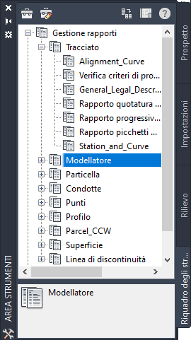 Nella scheda Riquadro degli strumenti sono organizzati i rapporti per ogni tipo di oggetto. I rapporti forniscono in un formato compatto e trasferibile i dati tecnici utili contenuti in una Carta. Alcuni sono in formato LandXML, con fogli di stile XSL predefiniti o personalizzati. Altri sono in formato VBA, con finestre di dialogo personalizzate che consentono di selezionare i dati e varie opzioni.