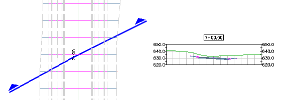 Quando la linea di sezione è perpendicolare alla linea base principale, la sezione riproduce la sezione tipo del modellatore in cui è inserita la progressiva in corrispondenza della quale la linea di sezione interseca la linea di base.