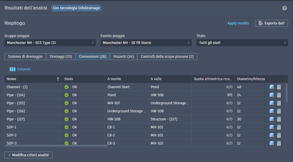 Una volta completata l'analisi del sistema, i risultati vengono riportati a livello di sistema e come categorie di oggetti: Flussi in ingresso, Condotte, Pozzetti e Acque piovane.