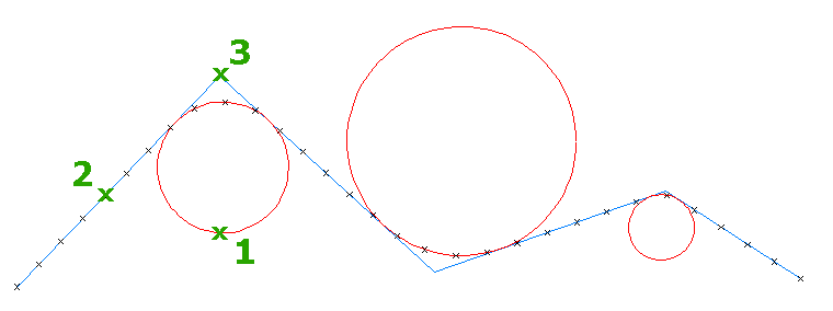 Autodesk Civil 3D calcola quindi le curve (1) in base alla sequenza dei punti e all'impostazione Raggio massimo per la rilevazione delle curve. Autodesk Civil 3D approssima la curvatura collegando i punti campione mediante segmenti lineari. Per aumentare la precisione durante l'utilizzo di linee caratteristiche o di entità AutoCAD, potrebbe essere necessario sfoltire punti campione intermedi dai dati di input originali o creati tra ogni coppia di punti campione. Quando una sequenza di punti ha un raggio maggiore di questa impostazione, i punti formeranno una tangente (2). L'intersezione apparente delle tangenti (3) è rappresentata dai punti di intersezione per le tangenti di tracciato.
