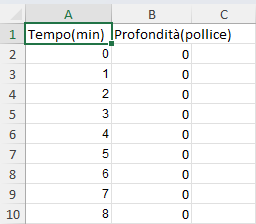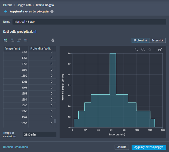 Nota: Devono essere presenti almeno 2 voci contenenti l'incremento dei minuti e la relativa profondità di pioggia in pollici (o millimetri, a seconda delle unità della Carta).