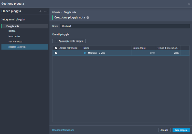 Nota: È necessario immettere almeno un evento pioggia prima di poter salvare il gruppo pioggia.