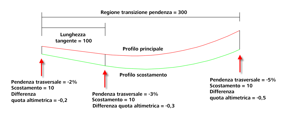Nei punti in cui è presente una regione di transizione specificata tra una pendenza trasversale e l'altra, viene creata la geometria del profilo di scostamento, come illustrato nell'esempio seguente.