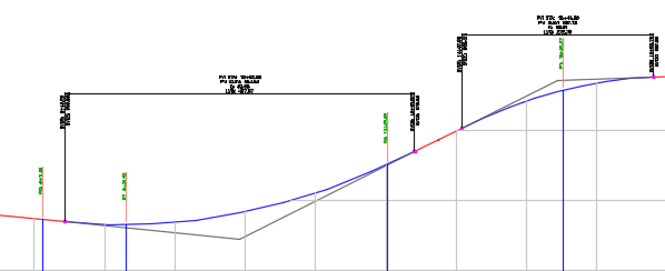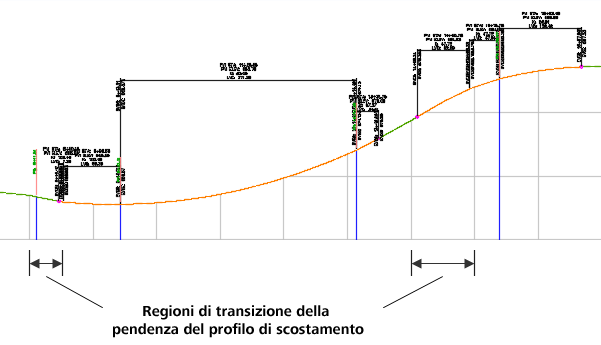 - Le parabole e le curve circolari nell'area della transizione della pendenza utilizzando il valore K o R delle curve del profilo di scostamento calcolate prima dell'applicazione della transizione della pendenza.