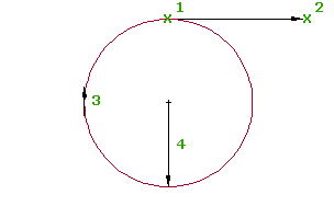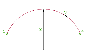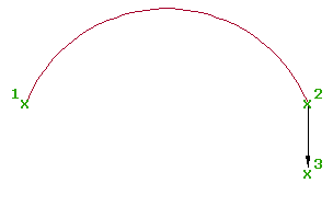 Il risultato è una curva con tre punti. La direzione della curva specificata (3) determina la posizione del punto di passaggio tra il punto iniziale (1) e finale (2).
