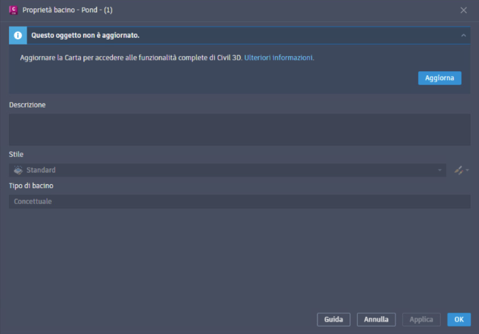 - Quando l'oggetto è stato creato con una versione precedente di Civil 3D, nel badge viene mostrato il messaggio "Questo oggetto non è aggiornato". Aggiornare la Carta per accedere alle funzionalità complete di Civil 3D. Fare clic sul pulsante Aggiorna per aggiornare l'oggetto alla versione corrente. Dopo l'aggiornamento, è possibile modificare completamente l'oggetto.